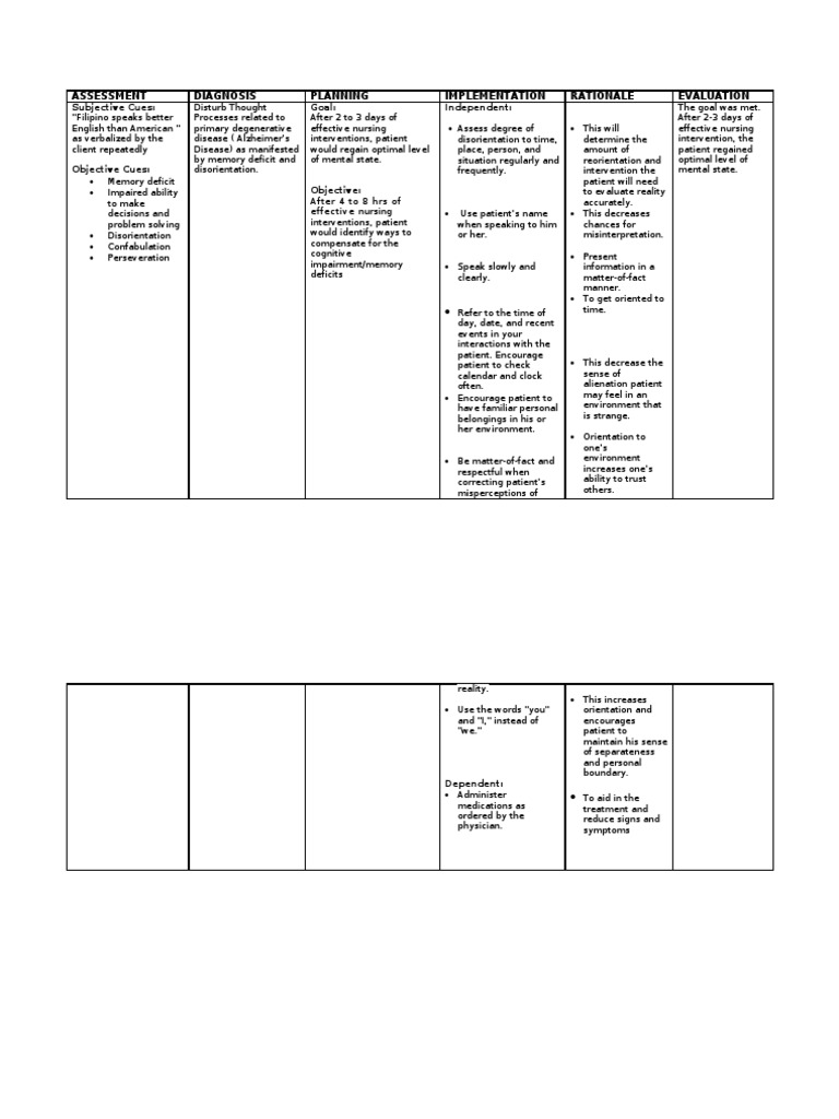 Related to Disorientation to time and place Confusion wandering at night Forgetfulness and increased memory loss Presence of motor disturbance ie. Evidenced by Not Applicable. Healthcare providers can now offer patients medications that will control symptoms and prolong functioning. 6 linhas Nursing Care Plan 1. Instruct family regarding avoidance of arguing with patient about what he thinks sees or hears. Within the whole duration of. Impaired verbal communication related to the change in thinking process. We know that exercise helps keep the heart healthy and may even help to slow the cognitive decline. Alzheimers Disease Patient The nursing care plan for the Alzheimers patient is also dietary and exercise needs.